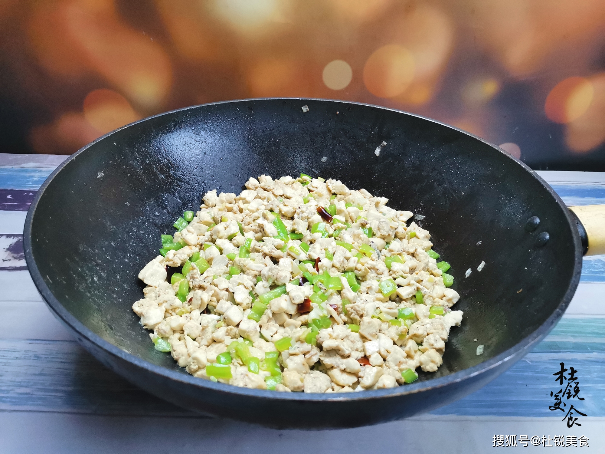 5、炒至虾酱鸡蛋凝固,下入鲜青辣椒小丁,再次中火快速翻炒至鸡蛋呈现出诱人的金黄色,立即停火。把做好的虾酱炒豆腐盛入浅盘,便可以趁鲜上桌享用。炒虾酱,牢记加入“去腥增香4样”,有人常忽略,难怪虾酱腥味重。