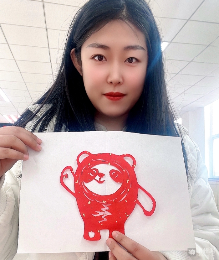 无棣县文化馆王玉琛女士展示她的剪纸作品——北京冬奥会吉祥物“冰墩墩”