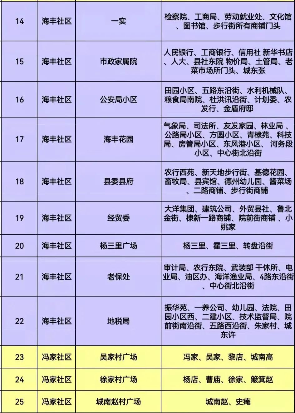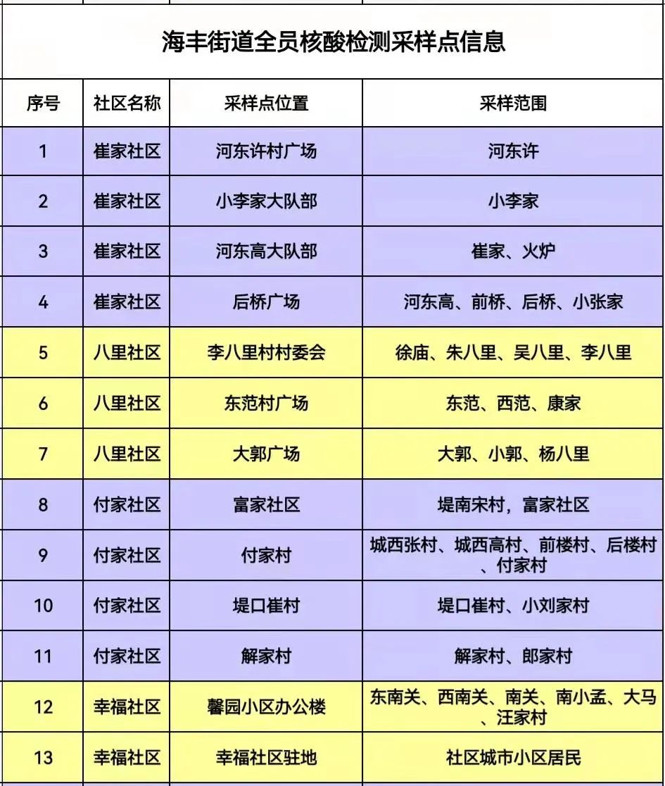 根据当前疫情防控形势,经研究部署,决定在海丰街道全域开展全民核酸检测工作,辖区内沿街商铺、建筑工地可就近选择采样点。