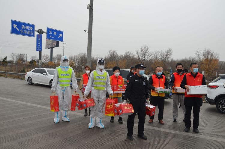 3月16日,无棣县商务局及县融媒体志愿服务队联合德正社工以及爱心商家,来到津汕高速无棣出入口,对一线防疫值勤工作人员进行了慰问。志愿者带去了羊肉包子、火腿、牛奶、方便面、矿泉水及棉大衣等物品。