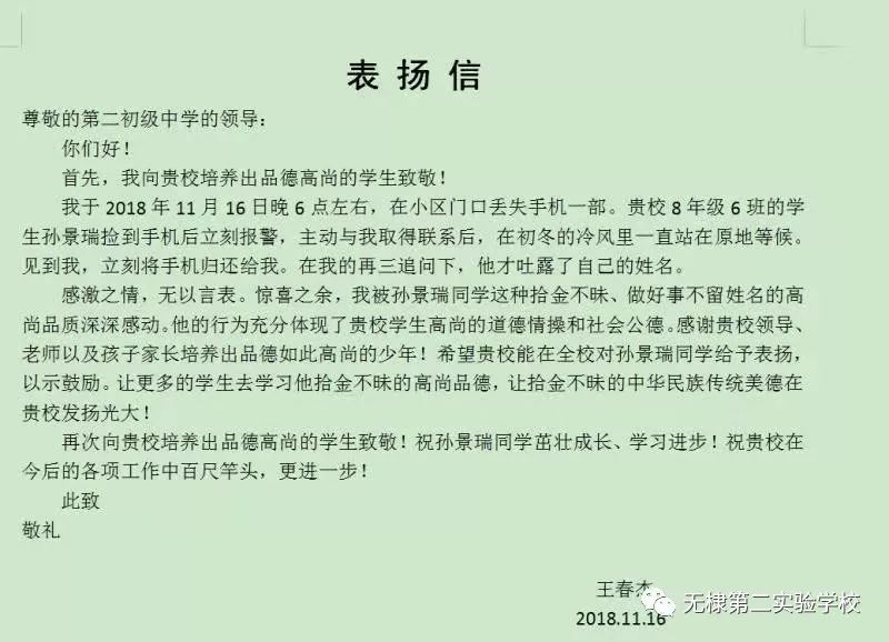 11月17日,县第二初级中学收到了来自居民王先生的感谢信,感谢我校八年级六班拾金不昧的孙景瑞同学,感谢学校培养了品德如此高尚的学生。