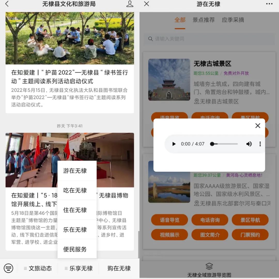 三、“一部手机游无棣”微信公众号改版上线。根据广大市民和游客需求,依托无棣文旅微信公众号,围绕“游在无棣、吃在无棣、住在无棣、乐在无棣、文化服务”等板块,紧紧围绕游客来无棣关注什么、需要什么、路怎么走、景怎么看、特色美食在哪品尝等实际需求展开,整合了县内文化场馆、景区、宾馆、餐饮、娱乐等商家上线,实现了县内全部景区、的语音导览、电话资讯、景区导航、视频展示、图文简介、门票预约6大功能。游客来到无棣,只需要关注无棣文旅微信公众号,就可以实现一键获取最新文旅资讯和文旅需求一站式服务。无棣也率先在全省县一级实现“一部手机游无棣”。