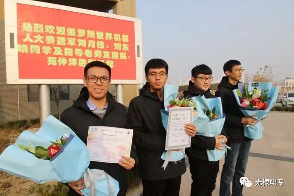 11月26日,滨州市无棣县,获得俄罗斯世界机器人大赛冠军的无棣县职业中专学生和带队老师载誉归来,受到热烈欢迎 。