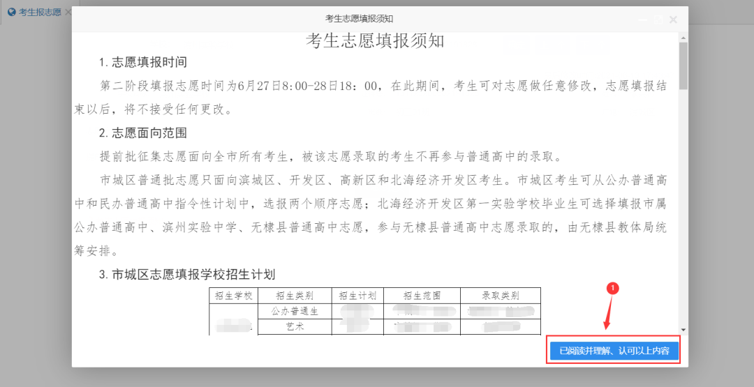 点击“已阅读并理解、认可以上内容”,即可以打开填报志愿界面。如对填报信息有疑惑,可以点击左下角的“考生志愿填报须知”,即可再次查看。