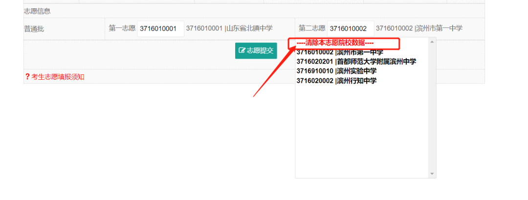 普通批选择第一志愿学校后,所选的学校不会在第二志愿的备选学校列表出现。因此,需要调整志愿顺序的考生,需要使用4.1提到的“清除选项”功能,来清理已选择的志愿(如已选择普通批的两个志愿,则都需要进行此操作),并重新从第一志愿开始选择。