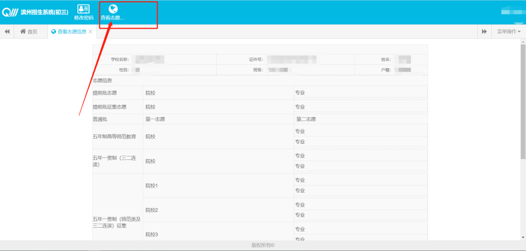 考生在完成志愿填报之后,点击查看志愿菜单,查看志愿填报情况,确认无误之后可退出系统。