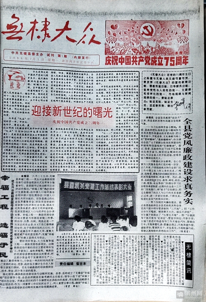 时隔36年后的1996年7月1日,中共无棣县委为庆祝中国共产党75岁华诞,决定将《无棣大众》复刊发行。此后,又从四开小报扩到对开四开大报。