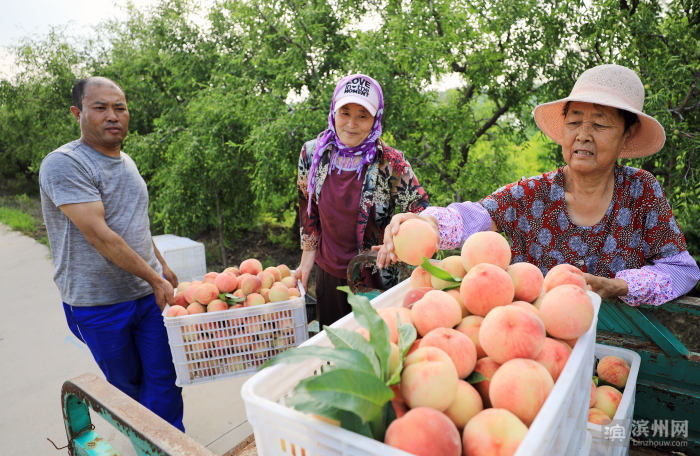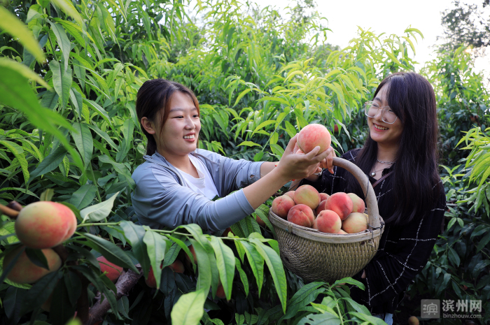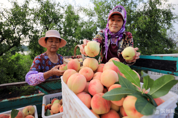 滨州日报/滨州网无棣讯 眼下,无棣县碣石山镇古家庄村的晚品种“久保桃”熟了,三五成群的粉红色的桃子挤在枝头,压弯的枝条在风中摇曳,向游人们展示着丰收的信息。