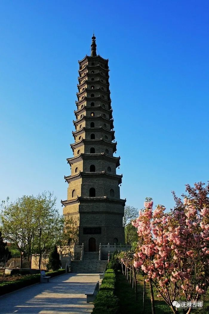 站在古井亭,南侧大觉寺,海丰塔一览无余。大觉寺有种空灵之美,古色古香,雕梁画栋,飞檐凌空,庄严巍峨的大殿气势非凡,蔚为壮观,令人纳罕。它始建于唐代贞观十三年(公元639年),原名普照寺,明朝洪武元年更名为大觉寺。取名大觉,就是取像佛教大佛或者学习大佛超出常人的智慧命名,教导人们积德行善、功德圆满,是当时闻名遐迩的香火胜地。明朝万历4年重建正殿。明朝崇祯12年建南大厅为天王殿。1300多年来,大觉寺与海丰塔,默默见证了唐、宋、元、明、清的盛衰巨变,让人寻访历史上这片古老大地上留下的遗迹,品味这神奇大地上的历史悠久和古老。海丰塔始建于唐贞观十三年(639年),碑记为“尉迟敬德监建”,距今已有一千三百多年。明代维修时,吏部尚书杨巍撰有《重修大觉寺宝塔》,并刻石竖碑。原名“舍利宝塔”,后亦称“大觉寺塔”,明永乐年间无棣为避朱棣讳易名为海丰,此塔亦随之改称“海丰塔”。 原塔已毁,现塔为复原建筑,塔分13级,高45米。外表砌大青砖,即古朴典雅又坚固耐久。海丰塔外廊是砖瓦结构,饰八棱飞檐挑角,角系铜铃,中心为水泥浇筑大圆柱,座基四门分陈,二级以上各层四窗开列,顶层八面环柱,上有佛光圆珠托半月组成塔刹。海丰塔上有高耸的塔刹,下为砖石构成的须弥座,楼阁式八角形,一色青砖砌就。每层塔角均悬有风铎,风起则铎鸣。更为奇特的是,站在古井亭,总是隐约听到空灵的大觉寺梵音袅袅,我曾多次观察仰望亭子是否设计者安装通往大觉寺的扩音设备,可汪汪的水隔着不近的距离,我什么也没看到。