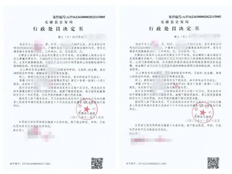 2022年11月26日,无棣县公安局车王派出所民警在工作中发现:违法嫌疑人马某旺、赵某鹏二人在2022年11月21日上午11时许到无棣县车王镇计生办核酸采样点为罐车押运员杨某山、罐车司机崔某海代做核酸检测,扰乱核酸检测秩序,违反防疫政策。民警立即将马某旺、赵某鹏、杨某山、崔某海四人传唤至派出所接受调查,经询问,该四人对其违法事实供认不讳。