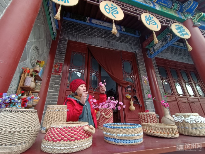 1月25日,在无棣古城文化旅游区,县级非遗麻绳编织传承人孙洪玉正在古城绳编坊整理非遗产品。