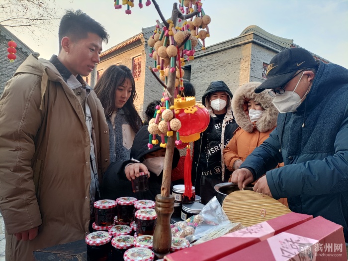 1月25日,在无棣古城文化旅游区,游客正在挑选非遗产品欢喜团。