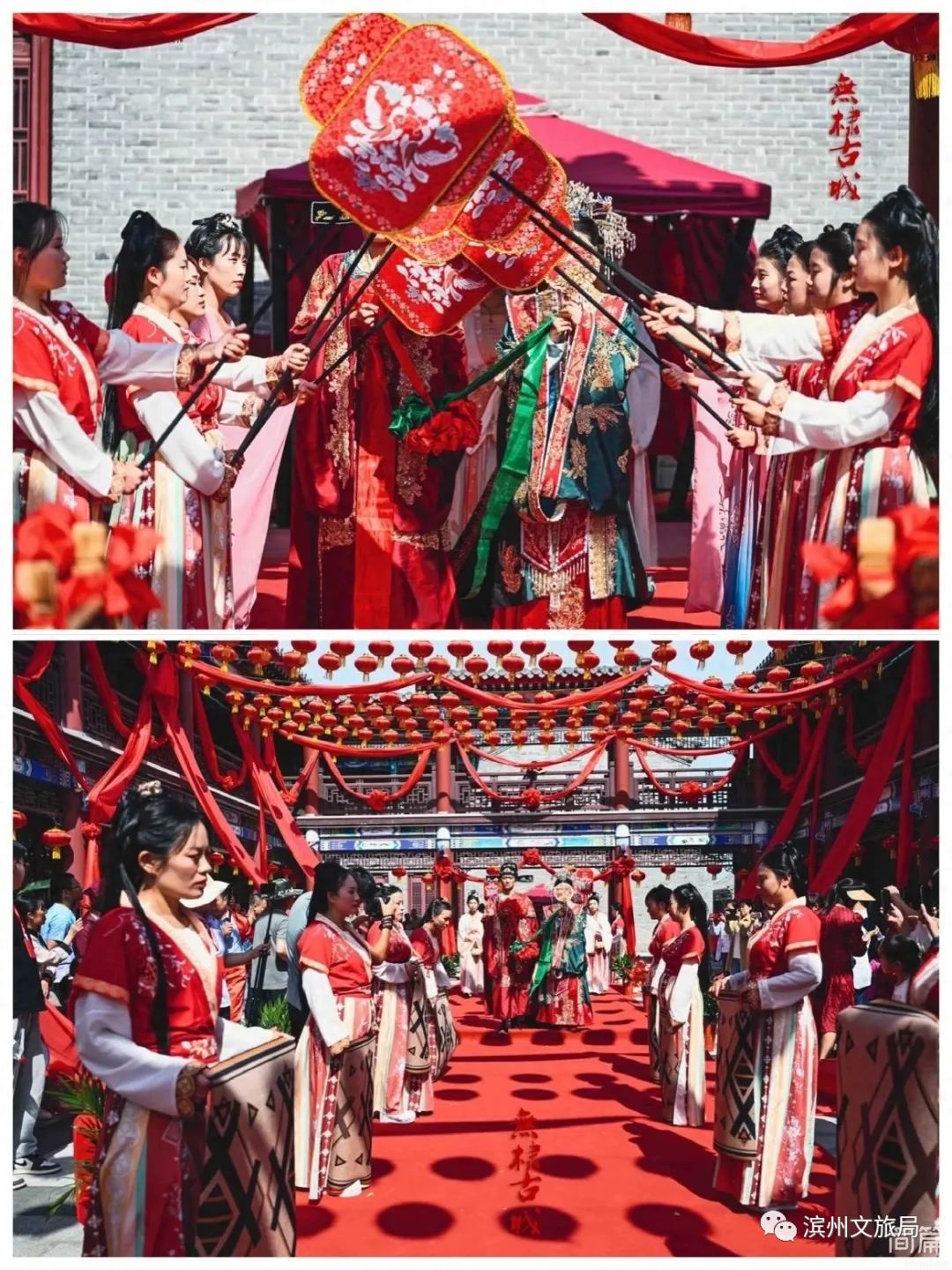 10点40分,举行了盛大的大宋制式婚礼。本次无棣古城推出的大型古式婚礼演艺分为出阁—接亲—成亲三个部分。婚礼现场大红灯笼高挂,迎亲门楼高悬道旗,花轿锦纱帷幔,韵味十足。新娘手持团扇,梳妆出阁,接亲游街,婚仪六礼。新人身着华美霓裳,步履优雅地进入典礼现场,在礼赞婚书、奉匜沃盥、却扇同席、解缨结发等仪式感满满的礼节中,让大家在温馨浪漫而又细致的仪式中感受华夏风骨的婚礼仪式。