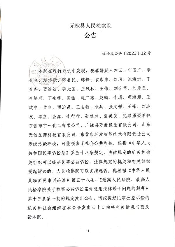 本院在履行职责中发现,犯罪嫌疑人左云、宁玉广、李金生、赵伟康、韩启民、韩锋、袁永康、刘琦、沈海洲、丁光杰、贾波波、李光国、王风林、王伟、刘金华、刘乐民、李培顺、丁金锋、田鑫、延广志、赵鹏、李瑞、项海超、王建中、孟刚、西治昌、王志敏、朱兵、张文强、王峰、刘连友、单杰、金鑫、李行行、孙建林、潘英亮、犯罪嫌疑单位东营市宇一化工有限公司、广饶县万鑫橡塑有限公司、山东天信医药科技有限公司、东营市环发智能技术有限责任公司涉嫌污染环境,可能损害了社会公共利益。根据《中华人民共和国民事诉讼法》第五十八条规定,法律规定的机关和有关组织可以提起民事公益诉讼,法律规定的机关和有关组织提起诉讼的,人民检察院可以支持起诉。现根据《中华人民共和国民事诉讼法》第五十八条、《最高人民法院、最高人民检察院关于检察公益诉讼案件适用法律若干问题的解释》第十三条第一款的规定发出公告,请拟提起民事公益诉讼的机关和社会组织在本公告发出三十日内将有关情况书面反馈本院。