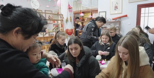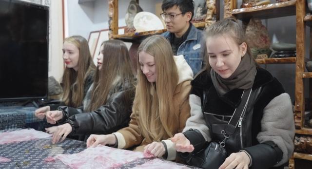 随后,大家又来到绣坊,第五代传承人牛国秀,向大家展示了其各样绒绣作品。在了解到这些栩栩如生的花鸟、鱼虫都是一针一线剟出来的后,年轻的尼古拉耶娃不禁惊叹地称赞,“这样恢弘的作品,确实这么精致地创作,真的很让人佩服。”随后,大家又跟随着一起制作了一个个漂亮的手工花灯,友人们穿上汉服,提着灯笼,迎着阳光和微风漫步在古城的街道上,共同感悟中国传统民俗中的深刻文化。