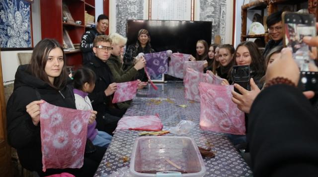 在植物扎染的非遗传承人巧姐(孙艳)指导下,外国友人们纷纷动起手来,点水巧攥,一条条奇特的花纹印在了绢布上,镜头前,大家自豪地展示着自己制作的手帕,称赞中国古老的技艺既神奇,又漂亮。