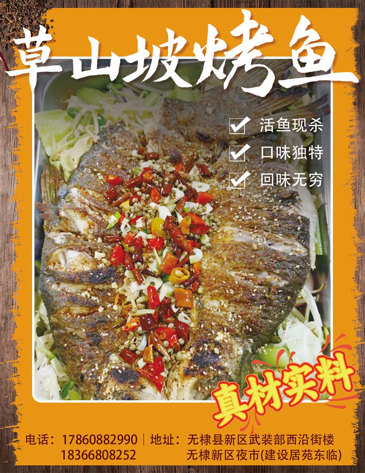 草山坡烤鱼位于无棣县新区武装部西沿街楼,也就是无棣县新区夜市,主营烤鱼和烧烤,烤鱼具有独特口味,青花椒烤鱼,麻辣烤鱼,酱香烤鱼,微辣烤鱼,活鱼现杀现烤,新鲜味美;烧烤类,鲜肉现烤,肉质鲜美,口齿留香,回味无穷,欢迎新老客户品尝。订餐电话:17860882990