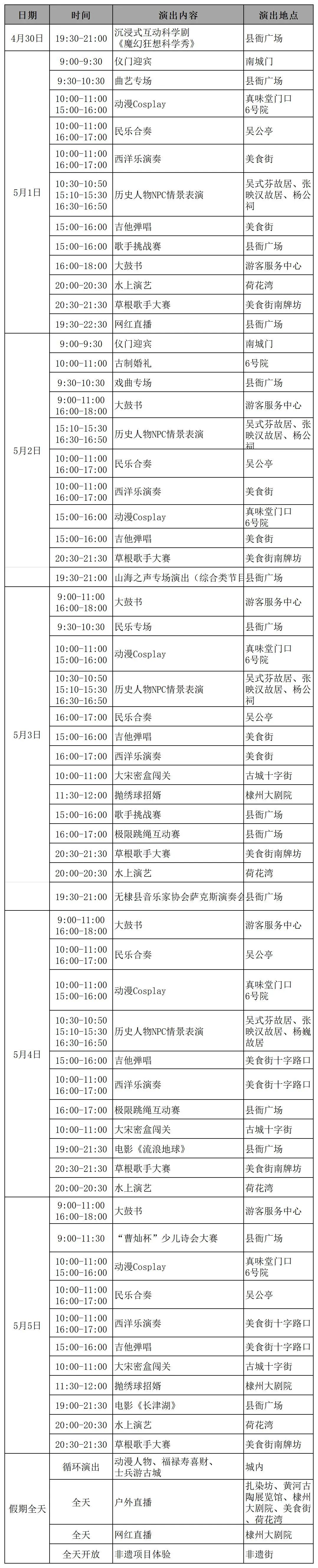 详细的古城五一假期景区演绎表来咯