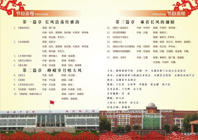 本次诗会由无棣县棣州希贤学校、无棣县第一中学、无棣县职工心连心公益协会主办,无棣县演讲与朗诵艺术协会、无棣县诗词学会、无棣县文化馆承办,无棣县车友协会、无棣县旅游实业发展有限公司协办。诗会共分“长风浩荡传雅韵”、“峥嵘岁月唱大风”、“乘着长风的翅膀”三个篇章。
