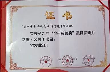 无棣慈善义工协会开展的“爱心牵手温暖贫困”春节送年货活动项目,荣获第九届“滨州慈善奖”最具影响力慈善(公益)项目,并获得了滨州市民政局、慈善总会给予的10万元的定向资助。