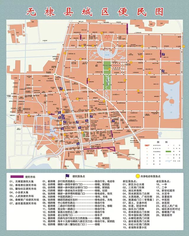 经过前期调研,在征求了部分经营业主和市民意见后,本着服务于市民的原则在城区设置了7处便民市场,16处便民服务点,26处松果电单车投放点,并制作了《无棣县城区便民图》,便民市场、便民服务点、松果电单车投放点已在便民图中标记。