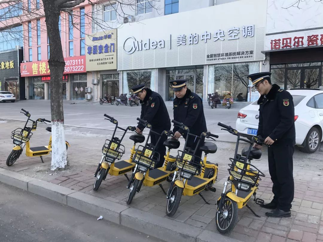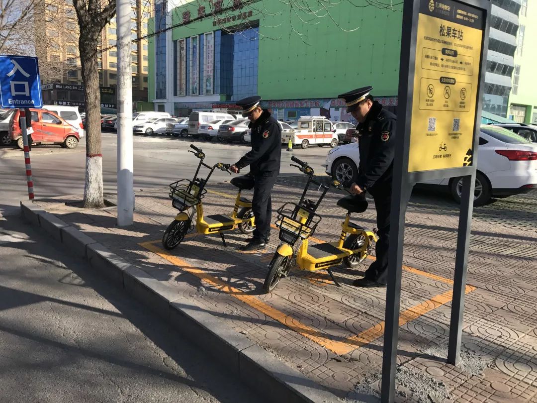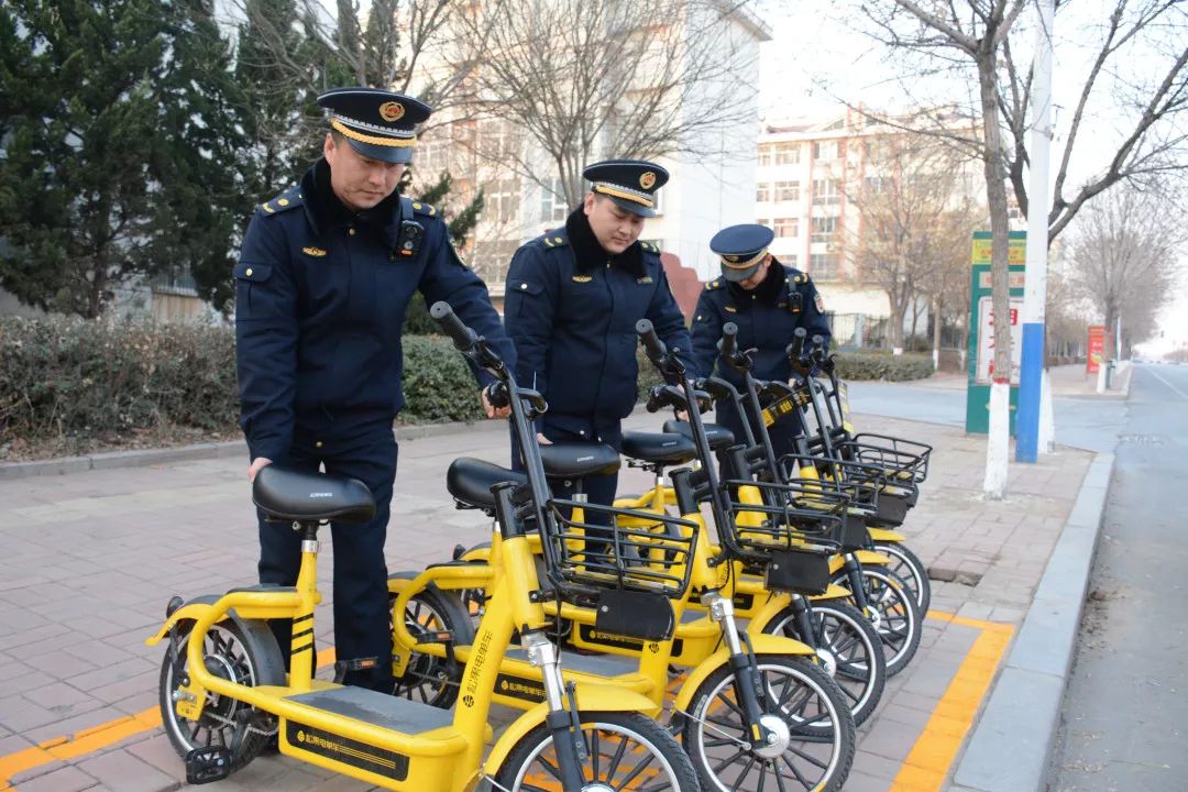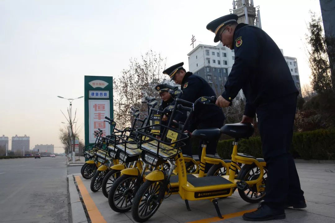 执法队员在恒丰国际投放地点对摆放不整齐的电单车进行有序摆放,禁止出现随处乱放的现象。