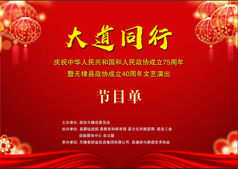 “大道同行”庆祝中华人民共和国和人民政协成立75周年暨无棣县政协成立40周年文艺演出将于9月22日晚6:30,在无棣古城县衙广场上演。本次晚会由政协无棣县委员会主办,县委统战部、县教育和体育局、县文化和旅游局、县总工会、县融媒体中心、县文联协办,无棣县财金投资集团有限公司、县演讲与朗诵艺术协会承办。