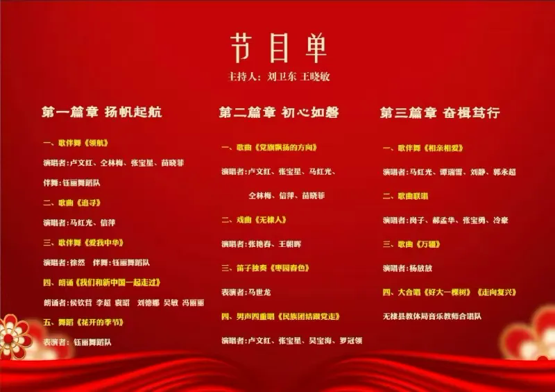 晚会分为“扬帆起航”“初心如磐”“奋楫笃行”三个篇章,综合运用多种艺术手段,热情讴歌中华人民共和国成立75周年来的光辉历程和伟大成就,深情表达无棣政协人投身中国式现代化建设、助力“强优富美”新无棣高质量发展的坚毅行动。