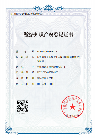 无棣海忠软管制造有限公司此次申请数据知识产权登记的产品为“用于海洋复合软管非金属材料性能甄选统计数据集”。该数据集涵盖了海洋复合软管非金属材料的关键性能指标,包括屈服强度、屈服应变、断裂伸长率、极限强度以及弹性模量等,助力企业精准甄选高性能的非金属材料,提升海洋复合软管的整体质量和耐用性,还能为相关领域的科研机构提供宝贵的数据资源,推动技术创新与产业升级。