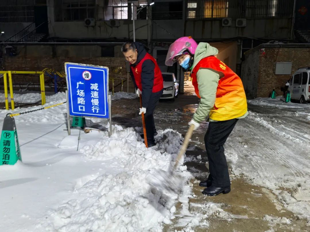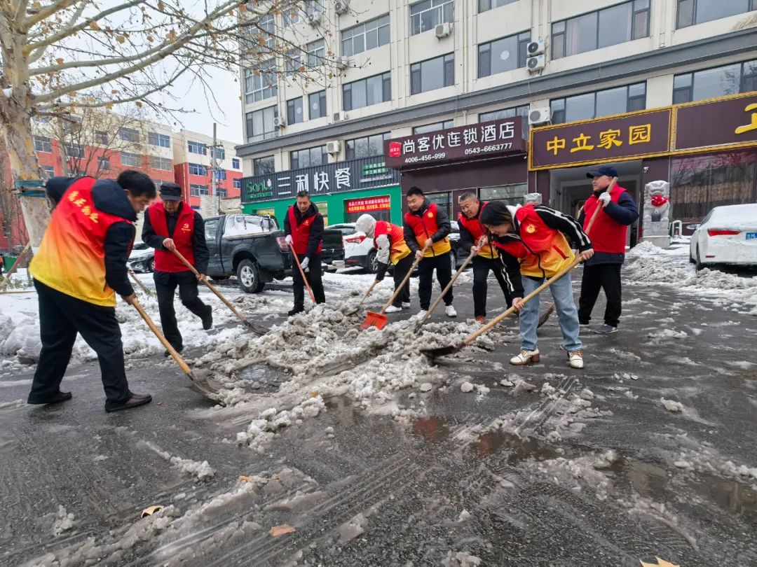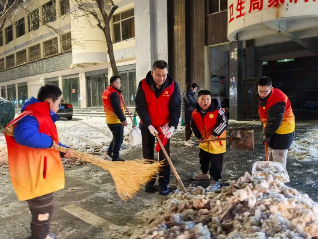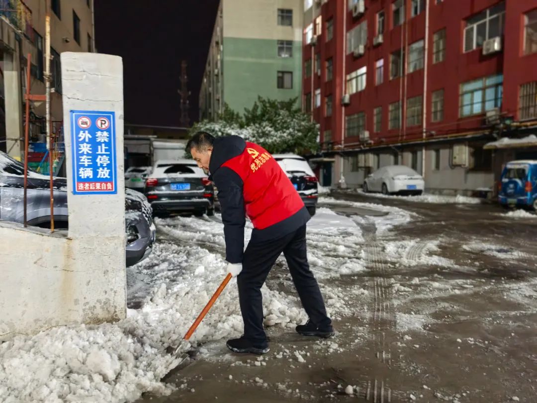 在除雪过程中,志愿者们的热情感染了小区居民和居家学生,他们也踊跃加入到扫雪队伍中来,一时间,志愿红成为了冰天雪地中一道亮丽的风景线。大家躬着身子,紧紧握着扫把、铁锹和除雪铲,一铲一扫,齐心协力将居民区和沿街主要出入道路的积雪堆到道路两边及树根下。