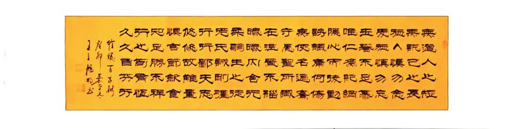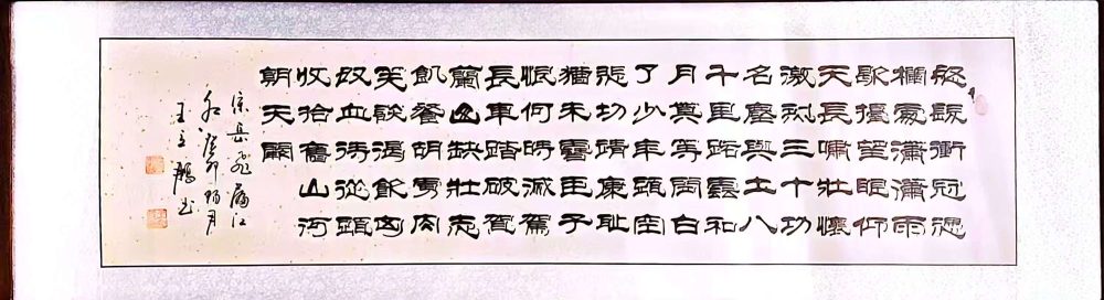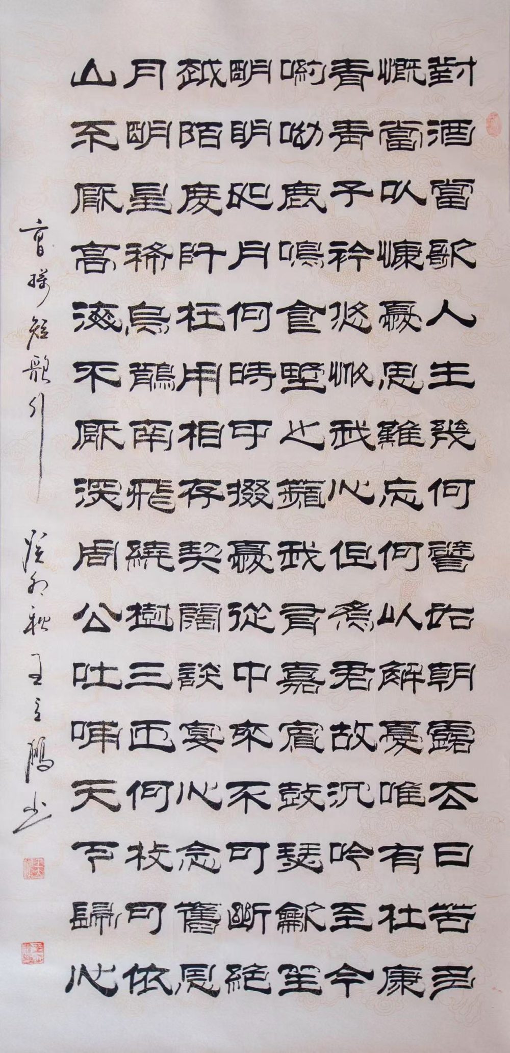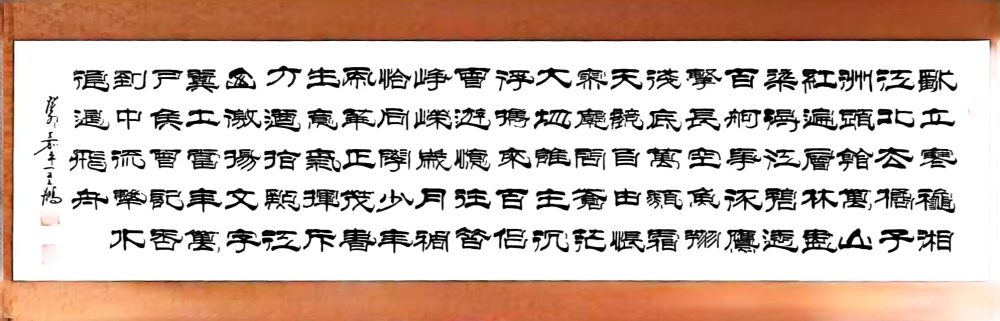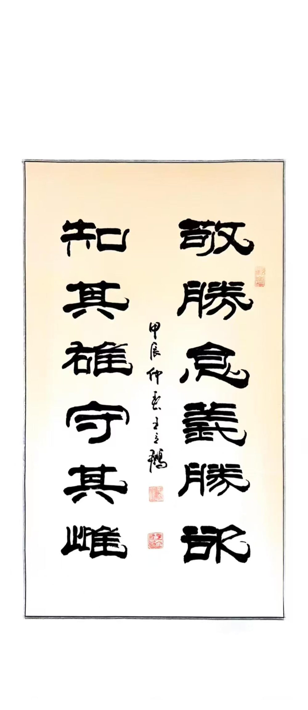 一直以来遵循“戒异守正,渊源有处,古朴厚劲,方正为正脉”的学习态度,吸收传统隶书精华,且师古不泥,积极追求并逐步形成了“在遒劲中体现圆润,在飘逸中透出凝重拙朴”的隶书风格,作品较好地展示了隶书的结体美、书势美、章法美、书意美。