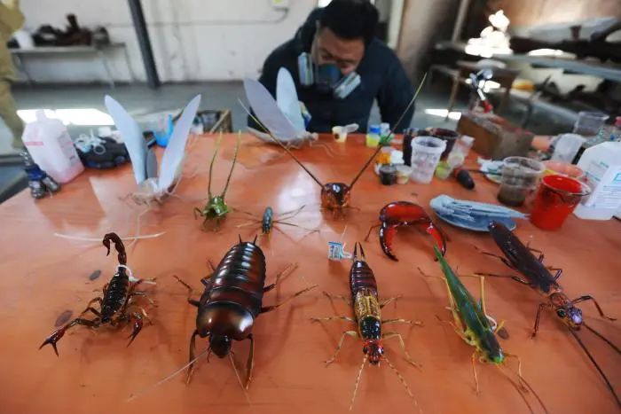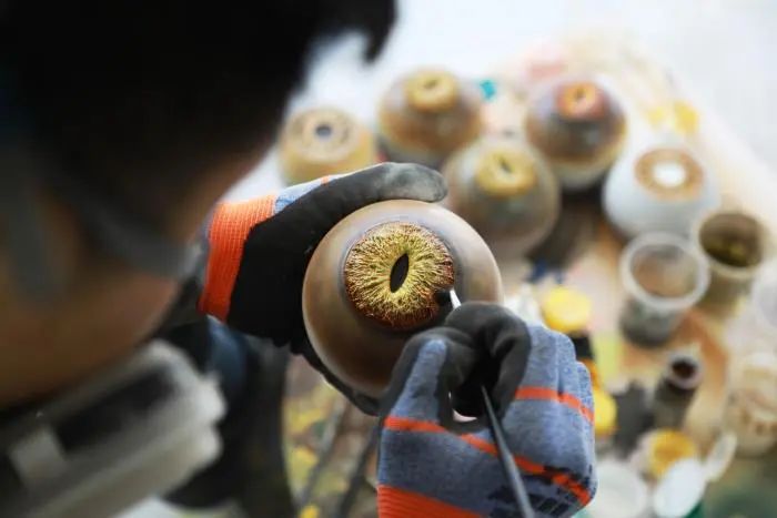 海百合制作团队正在为恐龙眼睛模型彩绘。