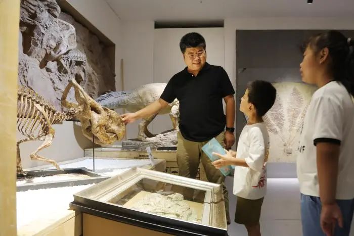《自然科学探索中心——恐龙之文艺复兴》滨州站展览上,张余房向前来观展的恐龙爱好者介绍。让恐龙在中国大地“复活”,让世人了解中国恐龙的丰富遗存,是他更大的愿望。