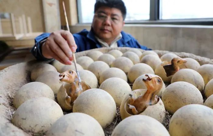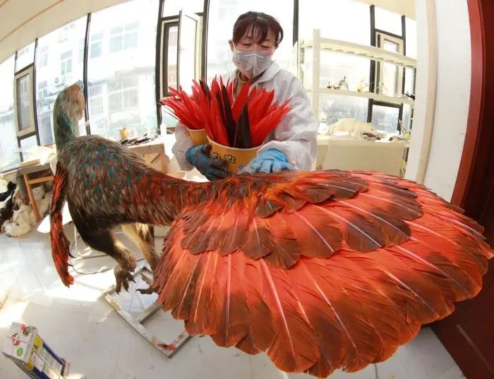 工人为窃蛋龙插制出美丽羽毛。