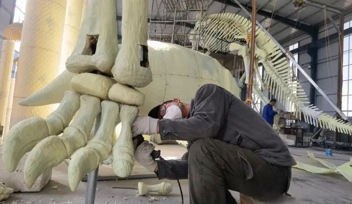 工人在安装恐龙的脚趾。