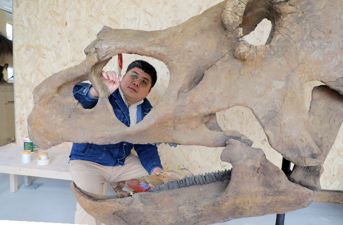 张余房为慈母龙幼龙复原模型上色。