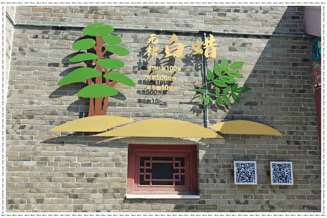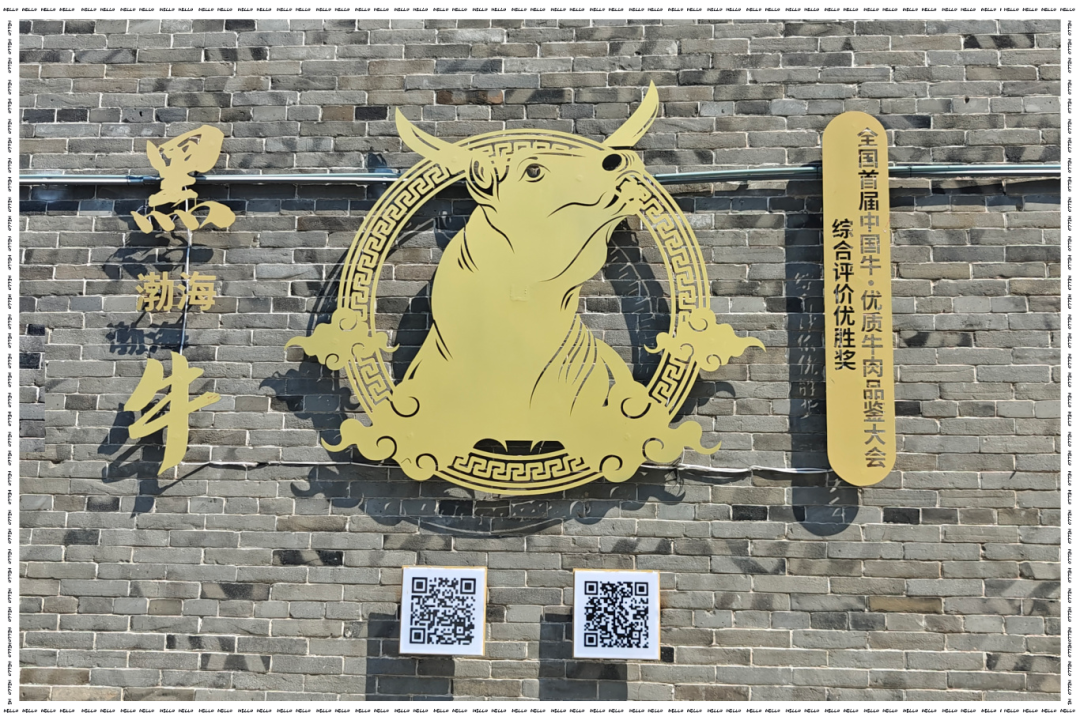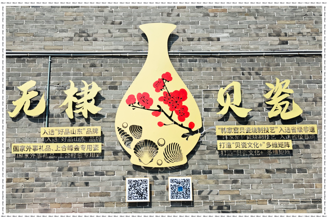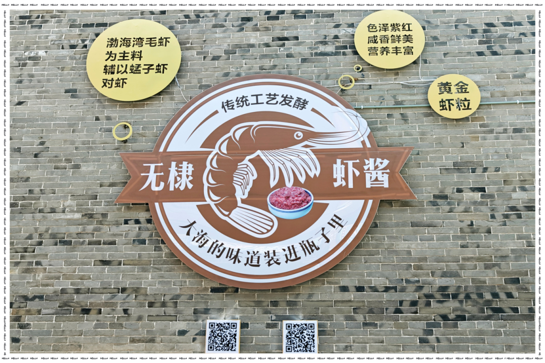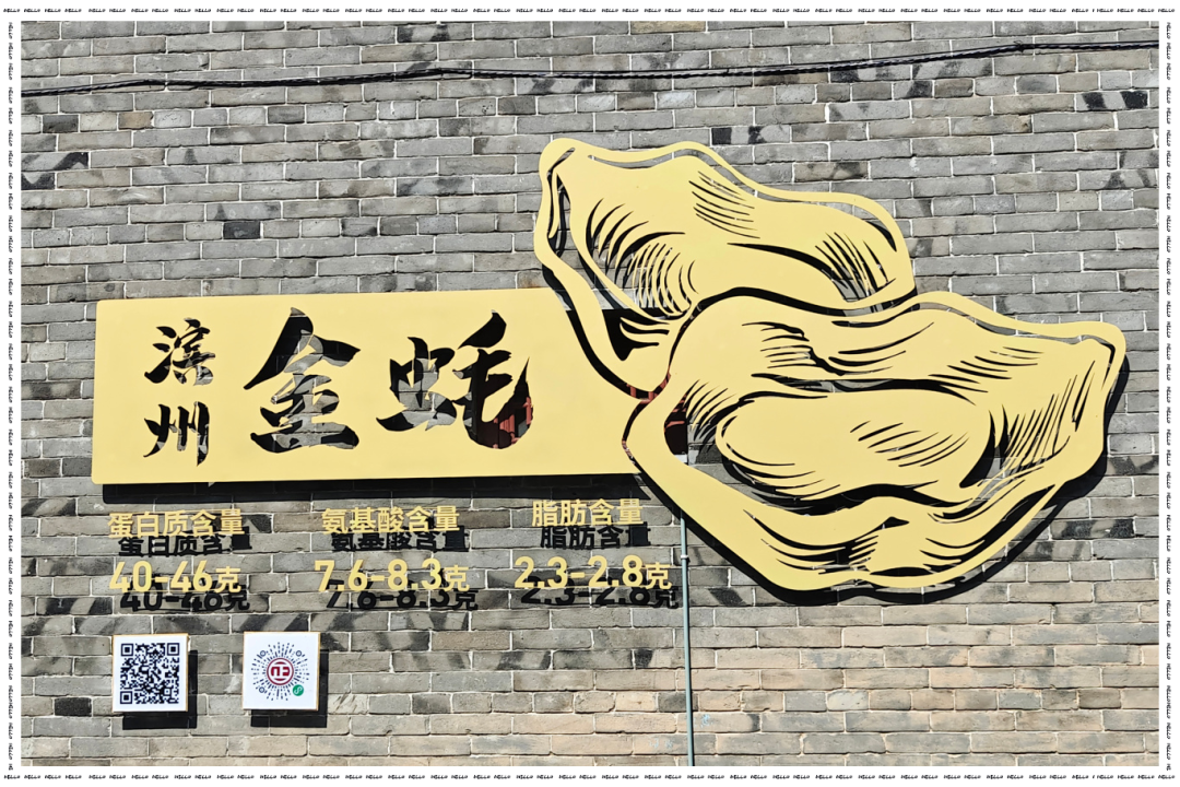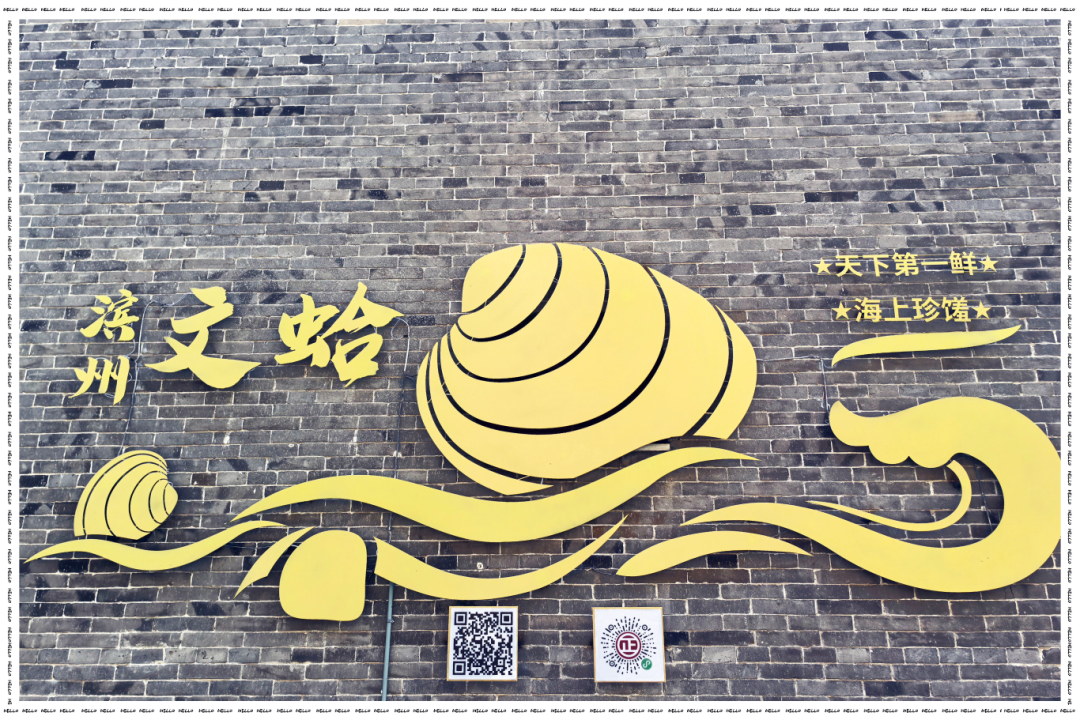 地标巷的灰墙上,12个地理标志图案以镂空浮雕形式跃然眼前,从无棣贝瓷到滨州文蛤,从渤海黑牛到无棣苜蓿,每个图案都承载着地方特色。入夜后,暖光灯带勾勒出轮廓,与古城灯火交相辉映,成为游客争相打卡的“网红墙”。而图案下的二维码则是“数字钥匙”,扫描即可获取产品简介、代表企业详情及联系方式,实现“展示-体验-消费”的无缝衔接。
