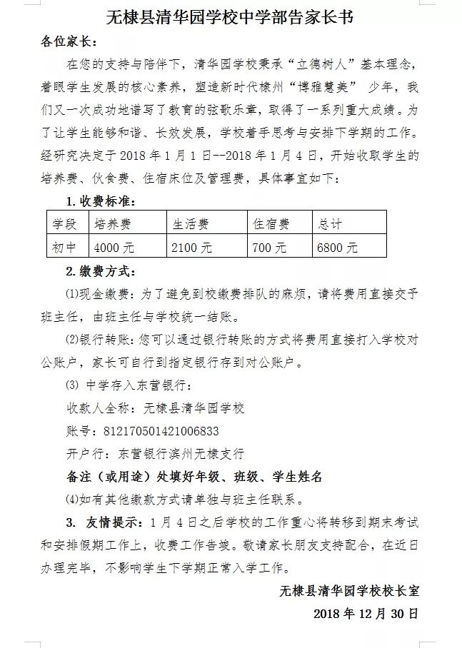 知悉清华园学校在2019年1月1日收取2018-2019学年第二学期费用时,每生增收1000元后,无棣县教育局高度重视,派专人通过接触家长、到学校了解等方式详细掌握有关情况。在此基础上,依据《中华人民共和国民办教育促进法》和《山东省人民政府关于鼓励社会力量兴办教育促进民办教育健康发展的实施意见》(鲁政发〔2018〕15号)文件精神,经研究,对清华园学校作出如下处理意见: