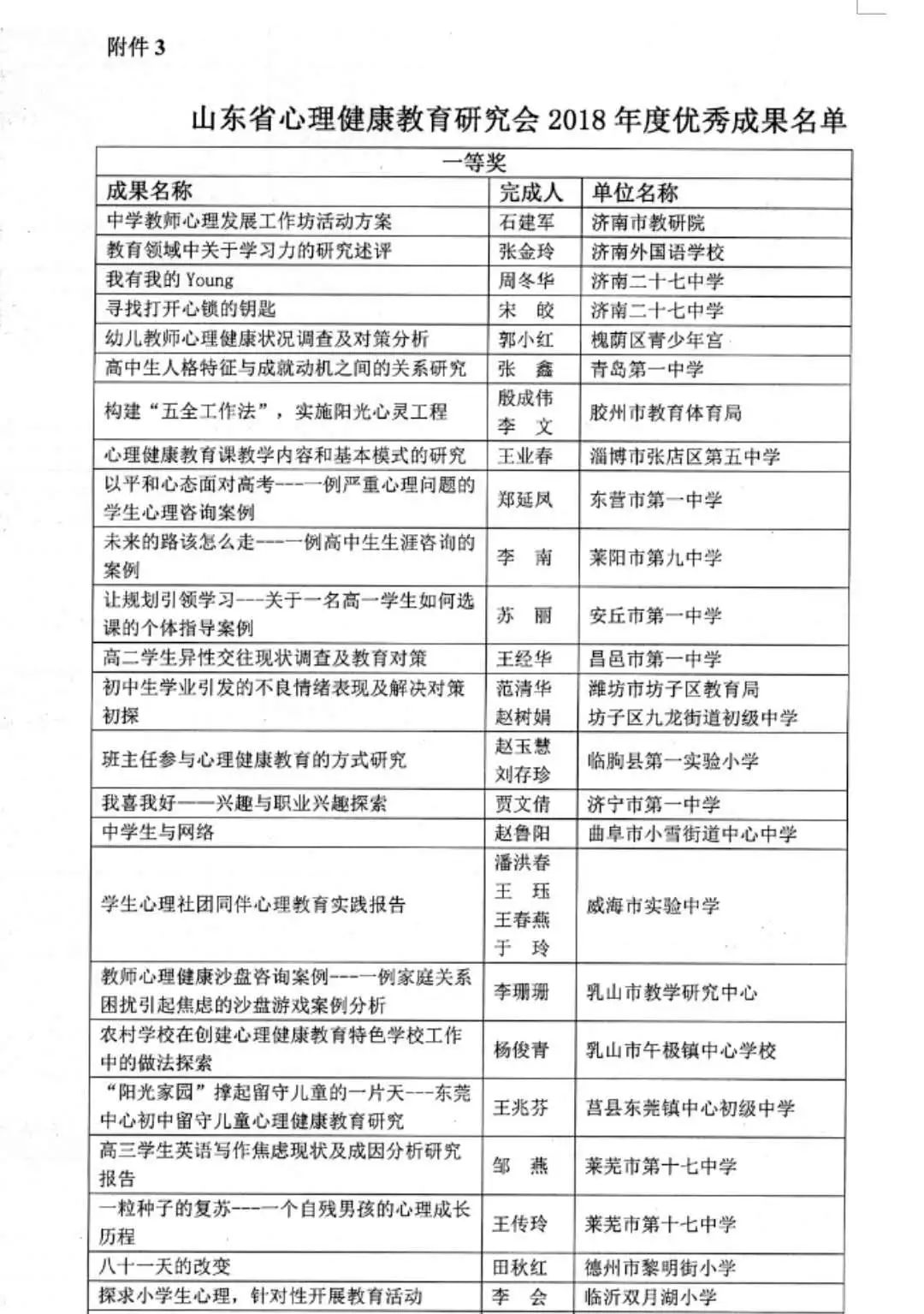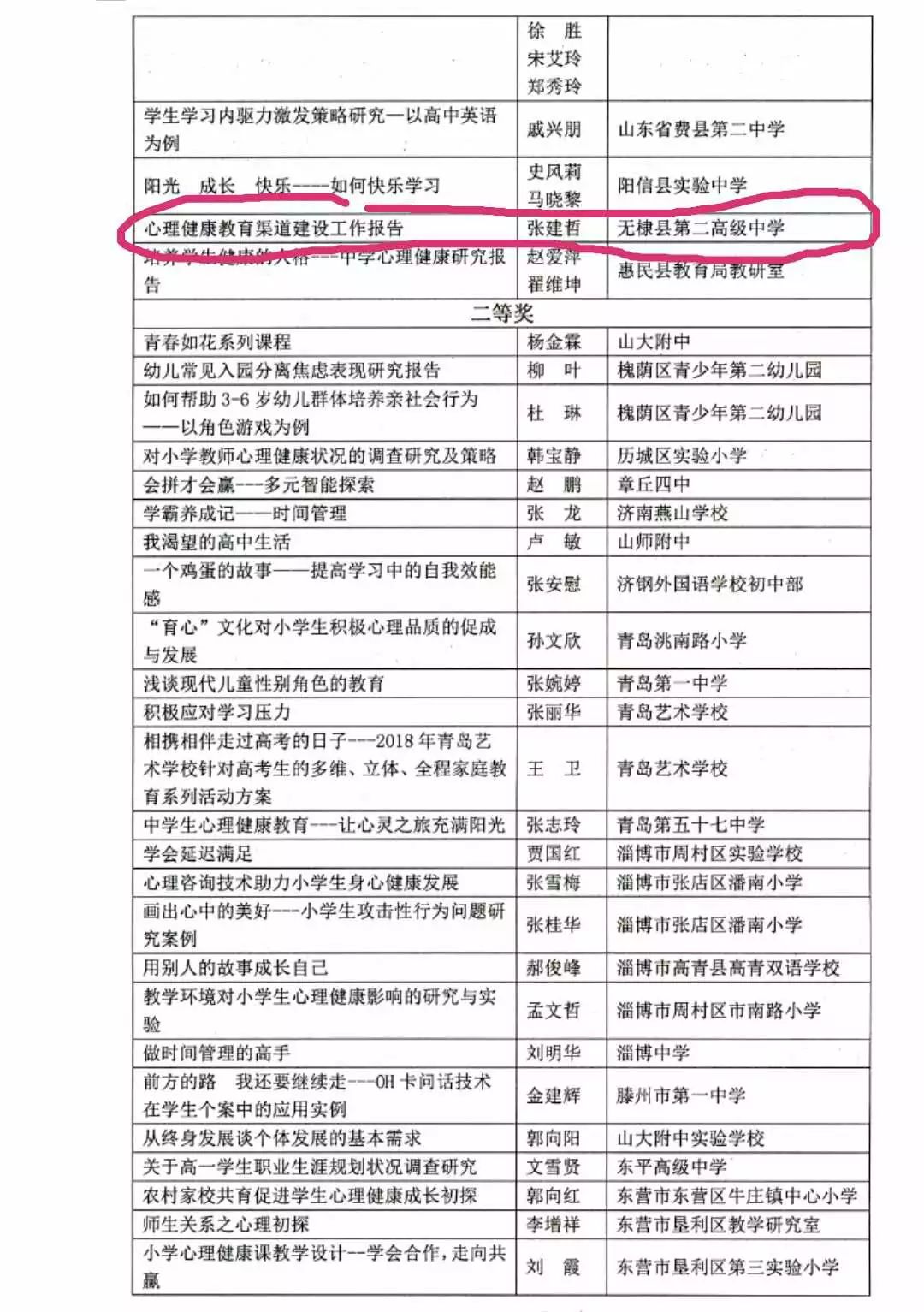 如果把心理健康教育工作比喻为一场战争,自2012年以来,我们战果辉煌。无棣二中先后被评为滨州市心理健康教育示范学校、滨州市心理健康教育特色学校、山东省心理健康教育先进单位。无棣二中心理老师也获得县教学能手、滨州市教育质量评价专家等荣誉称号。师生共同参与的心理健康教育课多次获得市县优质课一二等奖。心理健康教育工作,为学生的健康发展保驾护航!
