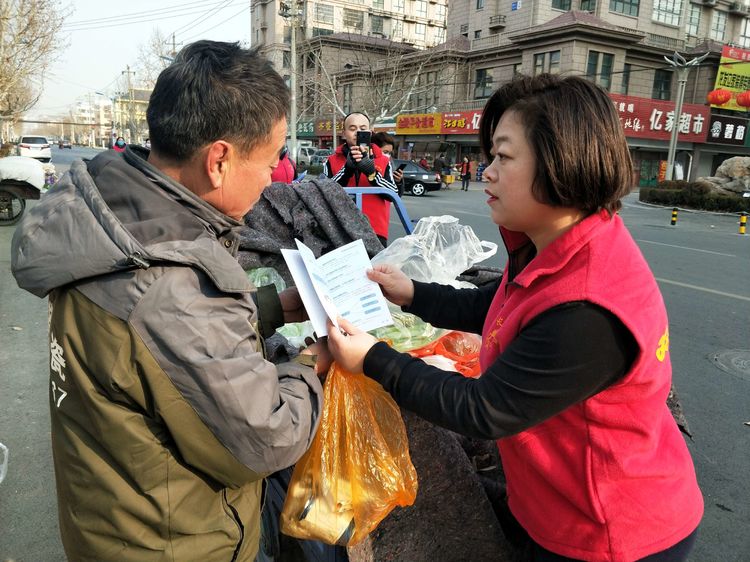 队员在途中向过往群众发放《居民健康保健知识手册》,宣讲绿色环保,健康出行。