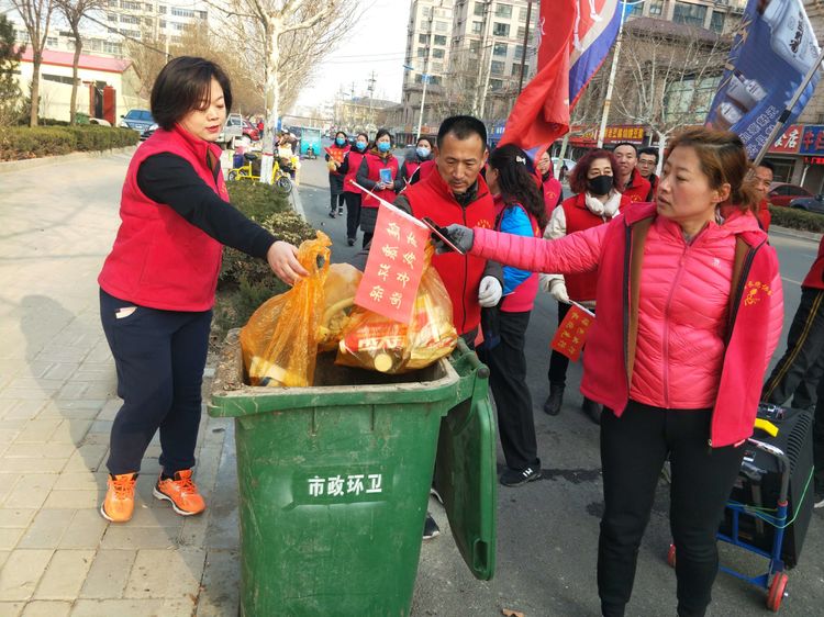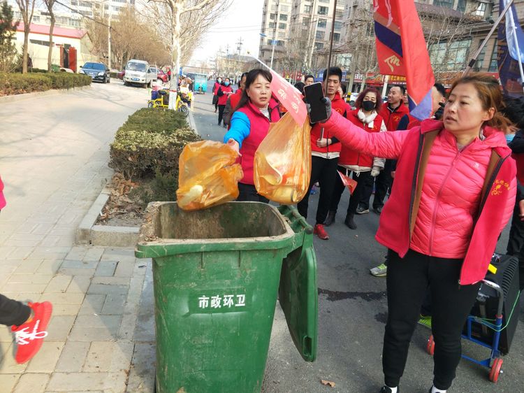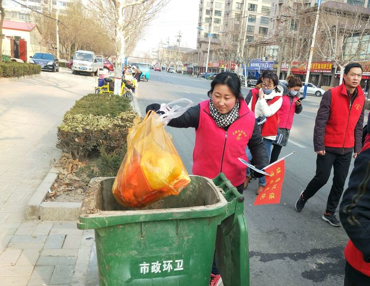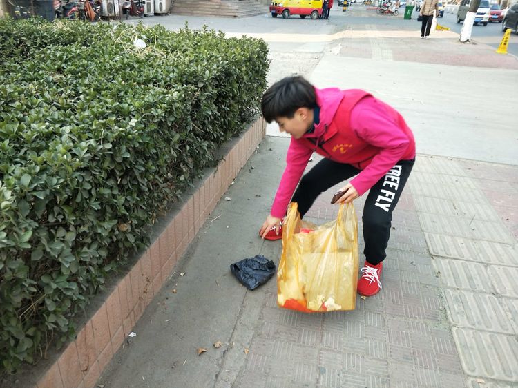 队员在途中捡拾垃圾,宣传健康环保,绿色出行。
