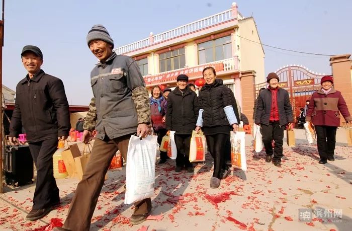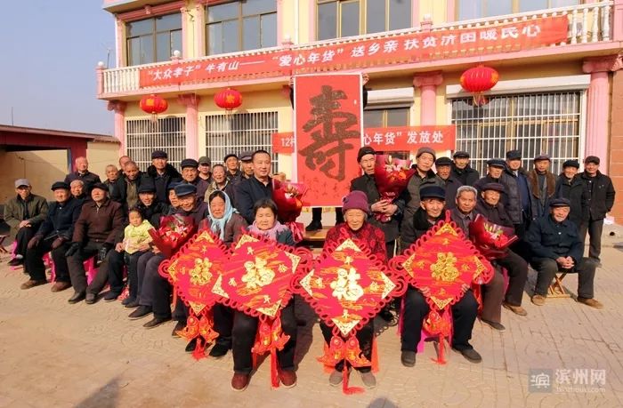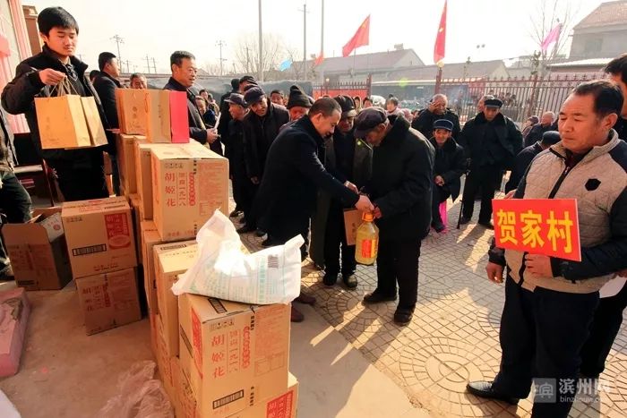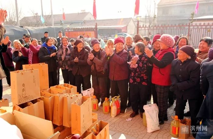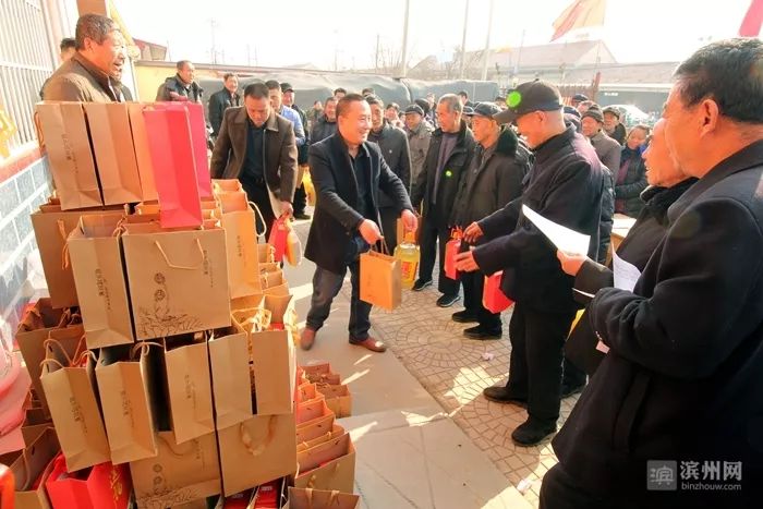 无棣县水湾镇鞠家村牛友山在现场为12个村的老人发放慰问品。