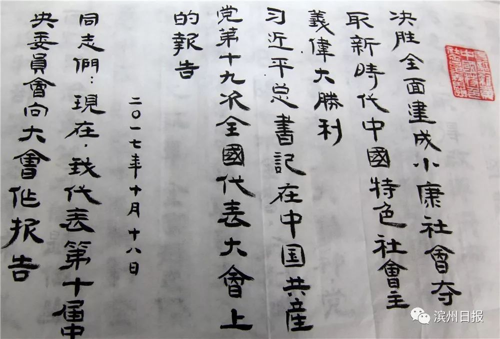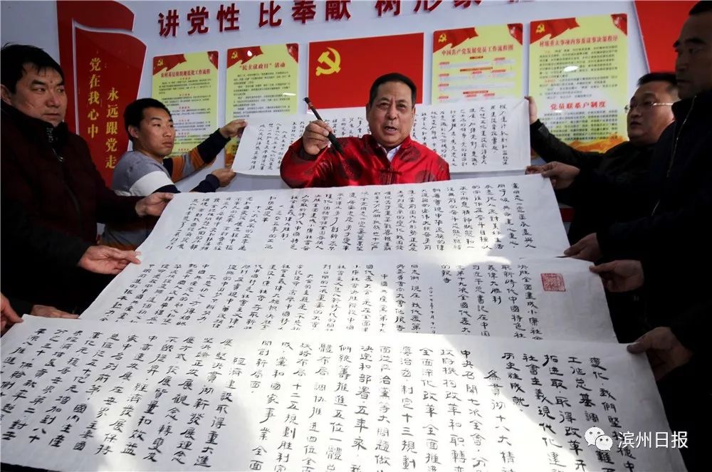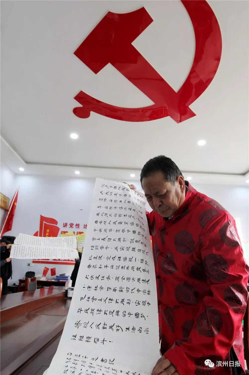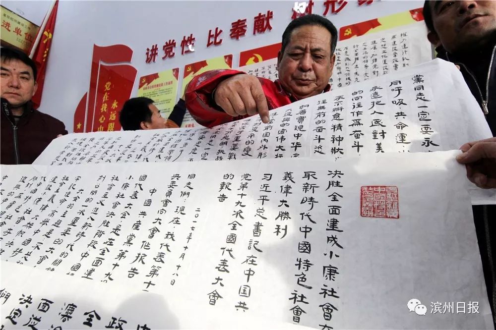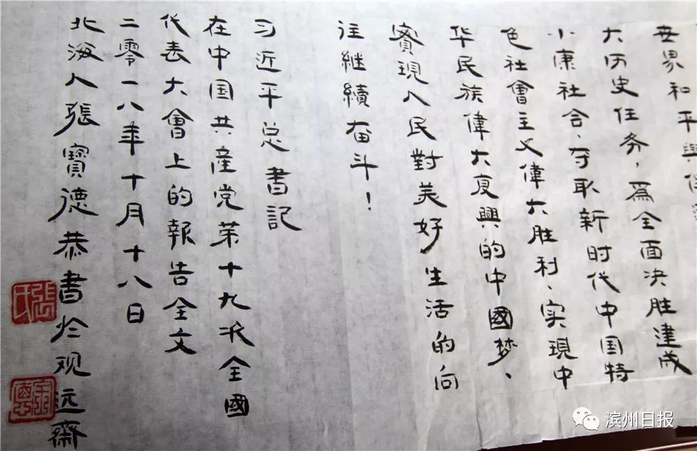 今年65岁的张宝德老人,是无棣县纪委监委一名退休干部。自2018年夏天至冬季,他耗时多半年时间,经过三次反复书写,逐句逐字斟酌,用毛笔手抄了习近平总书记在中国共产党第十九次全国代表大会上的报告全文。该作品共33000余字,通篇每个文字2公分见方,采用4尺宣纸横幅对开,计91张、全长120米;全文隶书,章法严谨、字体正规、笔墨肃静、卷面整洁。