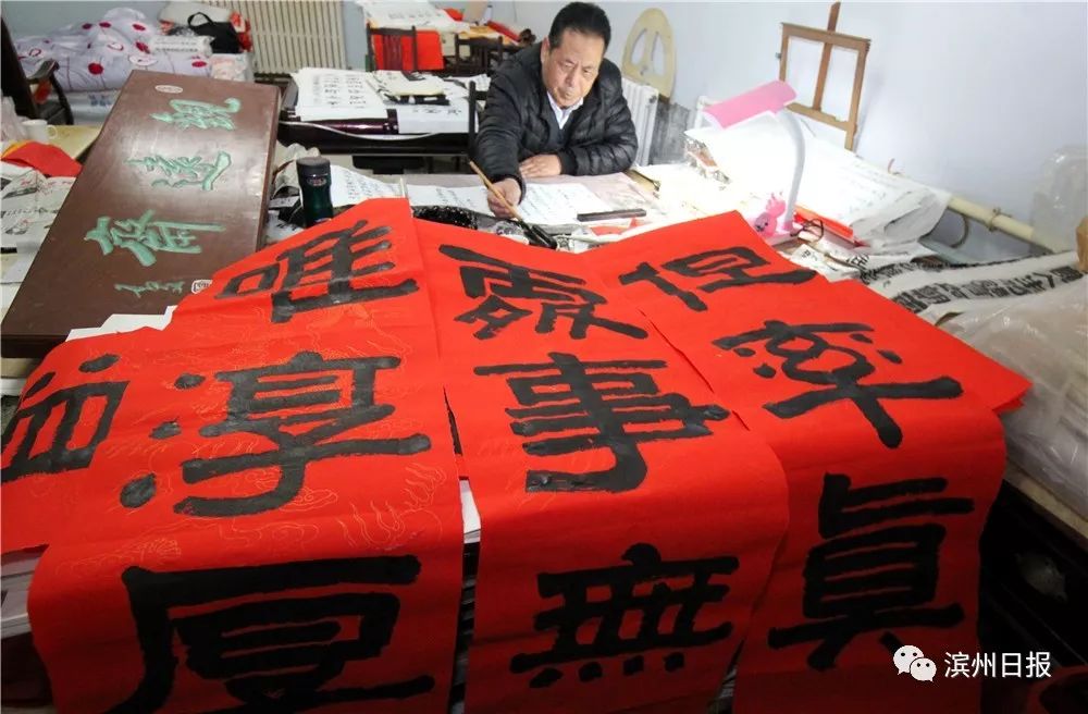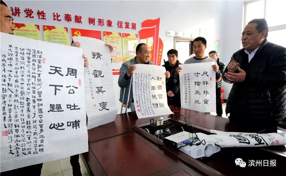 张宝德老人在无棣县佘家镇牛东村大队部向群众增送作品。