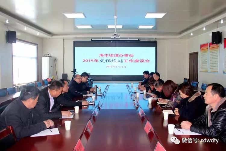 2 月 16 日上午,无棣县海丰街道办事处召开了 2019 年文化旅游工作第一次座谈会,为全年文化旅游工作谋篇布局,找思路,定方向,明任务。县文化和旅游局相关负责人、办事处部分文化旅游示范点、农业龙头企业、村支部书记参加了会议,县经济开发区绿色庄园家庭农场负责人受邀参加了座谈会。