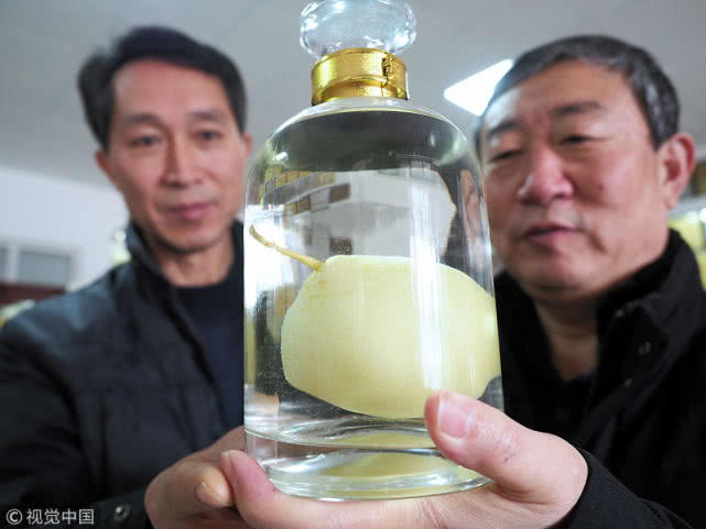 据了解,这款新奇的白酒外观跟普通白酒没有什么区别,只是在酒瓶中放了一个完整的鸭梨。 (来自:新闻摄影)
