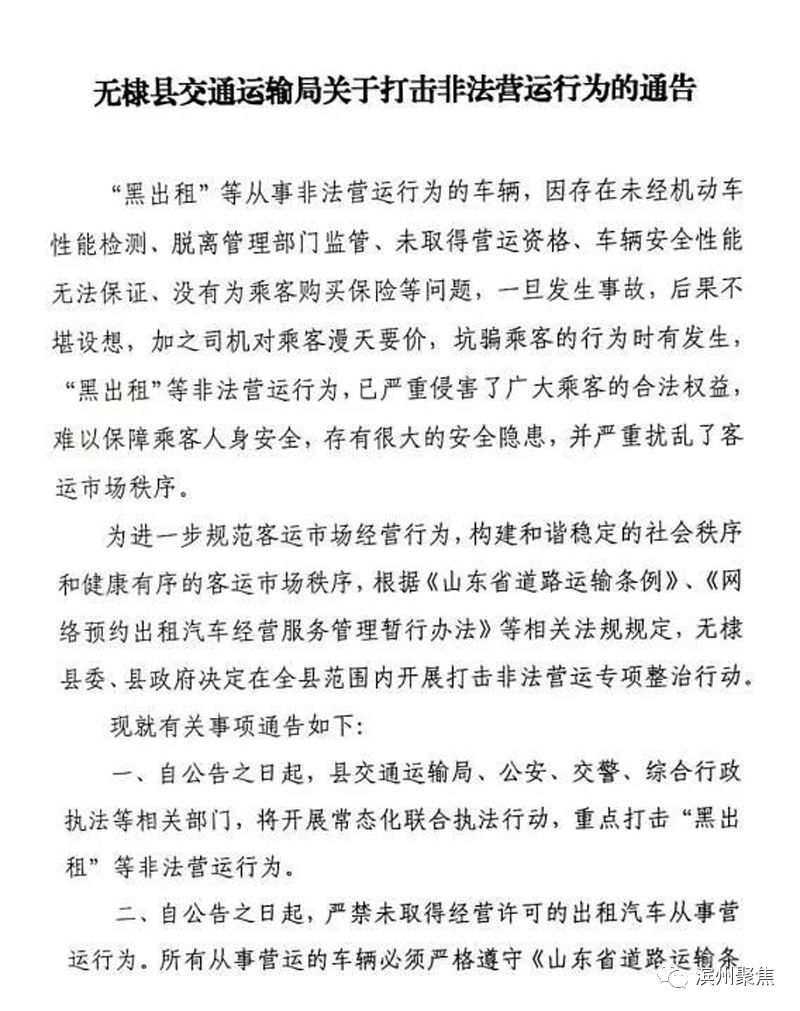 近日,为进一步规范客运市场经营行为,构建和谐稳定的社会秩序和健康有序的客运市场秩序,根据《山东省道路运输管理条例》、《网络预约出租汽车经营服务管理暂行办法》等相关法律规定,在省、市统一部署下,无棣县委、县政府决定在全县范围内开展打击非法营运专项整治行动,无棣县交通运输局向社会公开发布了关于打击非法营运的通告。