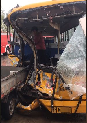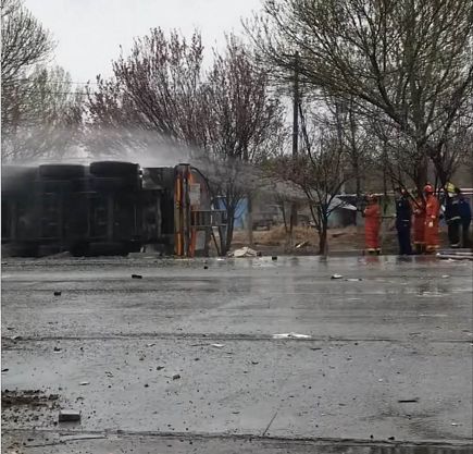 4月9日中午,在滨州市无棣县信阳镇王家村路口附近发生一起交通事故,其中一辆油罐车发生侧翻,还有一辆校车被撞。据网友反映:有孩子已经送医。