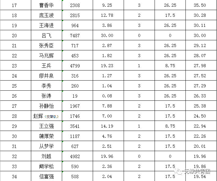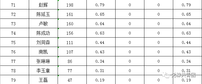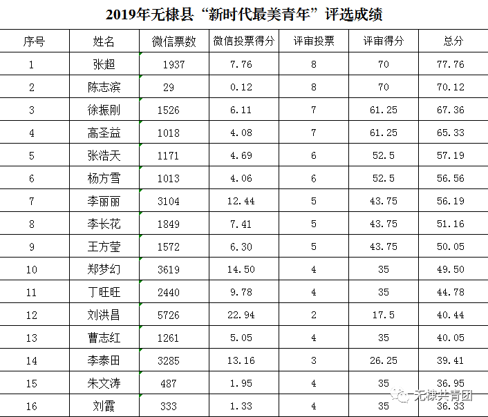 评选总分为100分,其中微信投票占30分、评审投票占70分。各类投票第一名得分为该项分值,其余人员投票得分=该项分值×(候选人该项得票数/该项投票第一名得票数),两类分数相加计算出最终得分,按照最终得分由高到低进行排名,现将79名候选人得分情况公布如下: