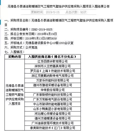 据悉,无棣县冬季清洁取暖煤改气工程燃气壁挂炉供应商入围项目公开报名公告中显示,该公告于4月19日发布,招标人为无棣县清洁取暖建设推进办公室;招标代理机构为山东睿圣项目管理有限公司。后经过公开竞选,共有15家企业入围,并与5月15日在媒体进行了公布。